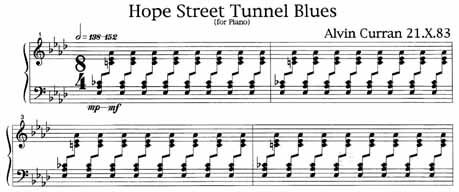 If the Glass pieces demonstrated Brubaker’s musical prowess (I can’t stop thinking about his tone), Alvin Curran’s Hope Street Tunnel Blues III demonstrated his technical control. I could describe the piece for you, but instead, I’ll just give you a little bit of the score and tell you the piece lasts over 16 minutes.