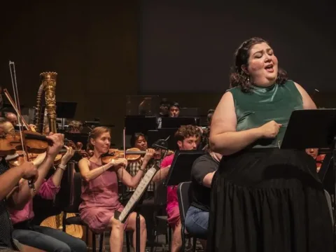 In the opening scene, we learn from a chorus of four, Black midwives that the infant Schomburg was born in Puerto Rico to a German merchant and a freeborn Black midwife from St. Croix. Performed by Hope Anthony, Sydnee Turner, Alec Redd, and Gizelxanath Rodriguez, the folkish banter and gleeful complacency of these characters are spoken and layered into the tapestry of Barson’s skillful composition. Anthony returned in the following scene, joined by Kelsey Robinson in a portrayal of the young Schomburg. Anthony was transformed into Schomburg’s white European school teacher, who lectures the headstrong boy and asserts that people of Black African descent possess no history and therefore are precluded from future accomplishment. Motivated by his disbelief, Schomburg resolves to become a historian and uncover and document the ancient, vibrant history from which he descends.